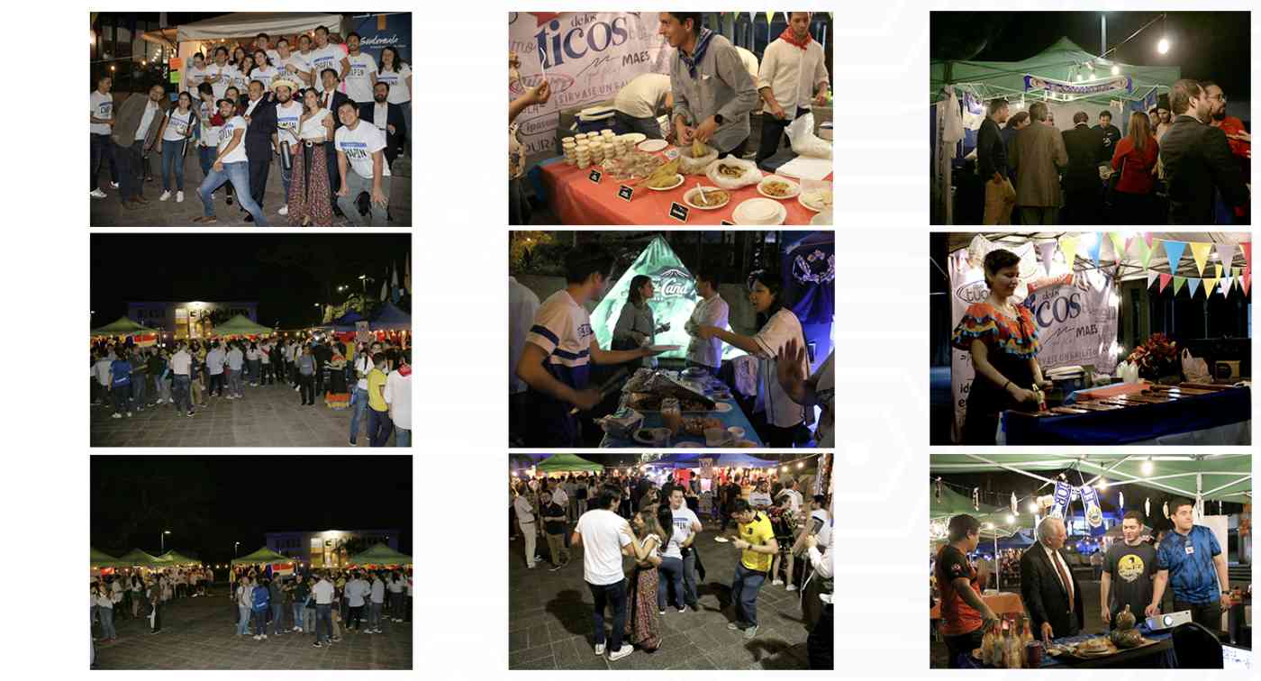 Una vez finalizado el espectáculo, los invitados se trasladaron a la “Plaza Banderas”, a disfrutar de la famosa “Vuelta al Mundo”, en donde los estudiantes se agruparon en stands por países, ofreciendo delicias culinarias y bebidas tradicionales, que fueron degustadas por los presentes. Los países representados fueron: Ecuador, Panamá, Nicaragua, Bolivia, Honduras, Perú, Guatemala, El Salvador, Costa Rica y Países Bajos, Colombia y Belice participaron juntos.