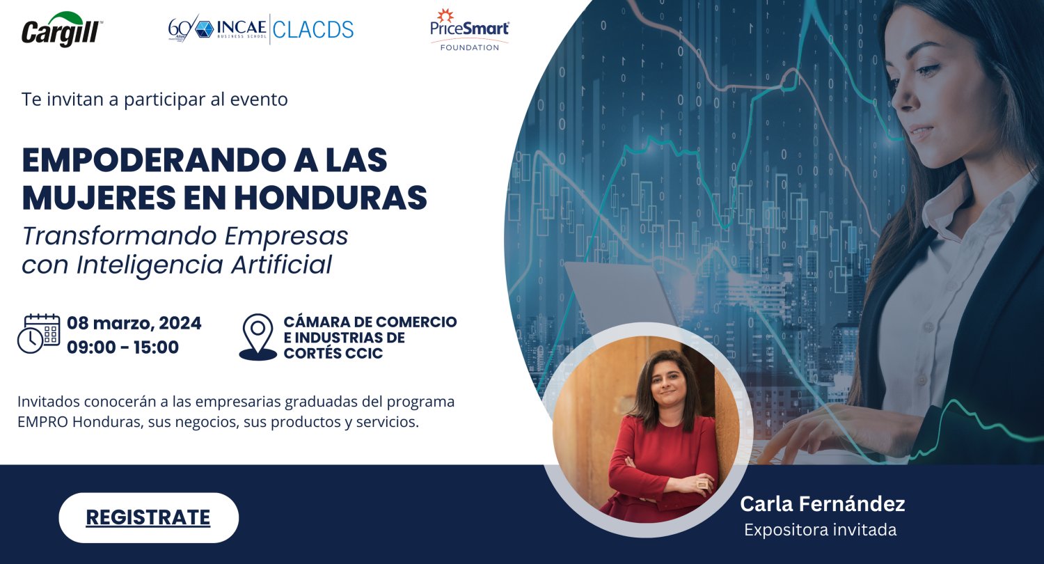 En el marco del Día Internacional de la Mujer, mañana viernes 8 de marzo, INCAE Business School, Pricesmart Foundation, Cargill y la Cámara de Comercio e Industrias de Cortés (CCIC) se enorgullecen en invitarles a un evento para celebrar el empoderamiento empresarial femenino en Honduras. La celebración se realizará en el marco del programa “Empresarias Progresando” (EMPRO Honduras), bajo el cual emprendedoras hondureñas están haciendo crecer sus negocios gracias al conocimiento y las destrezas adquiridas.