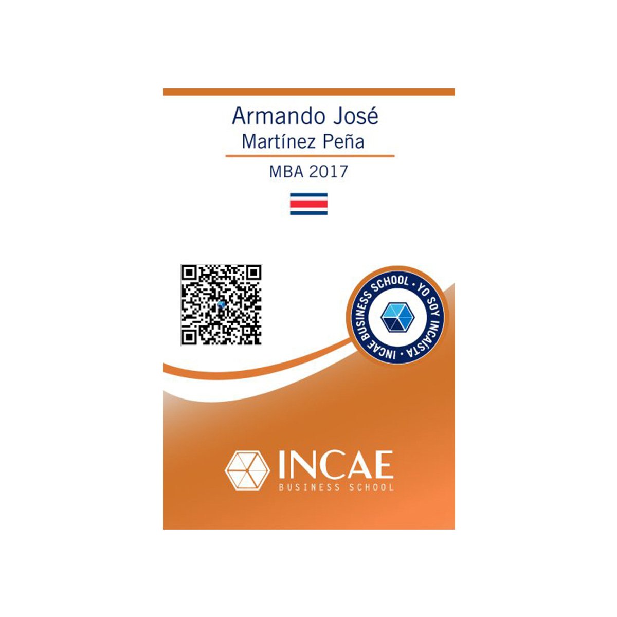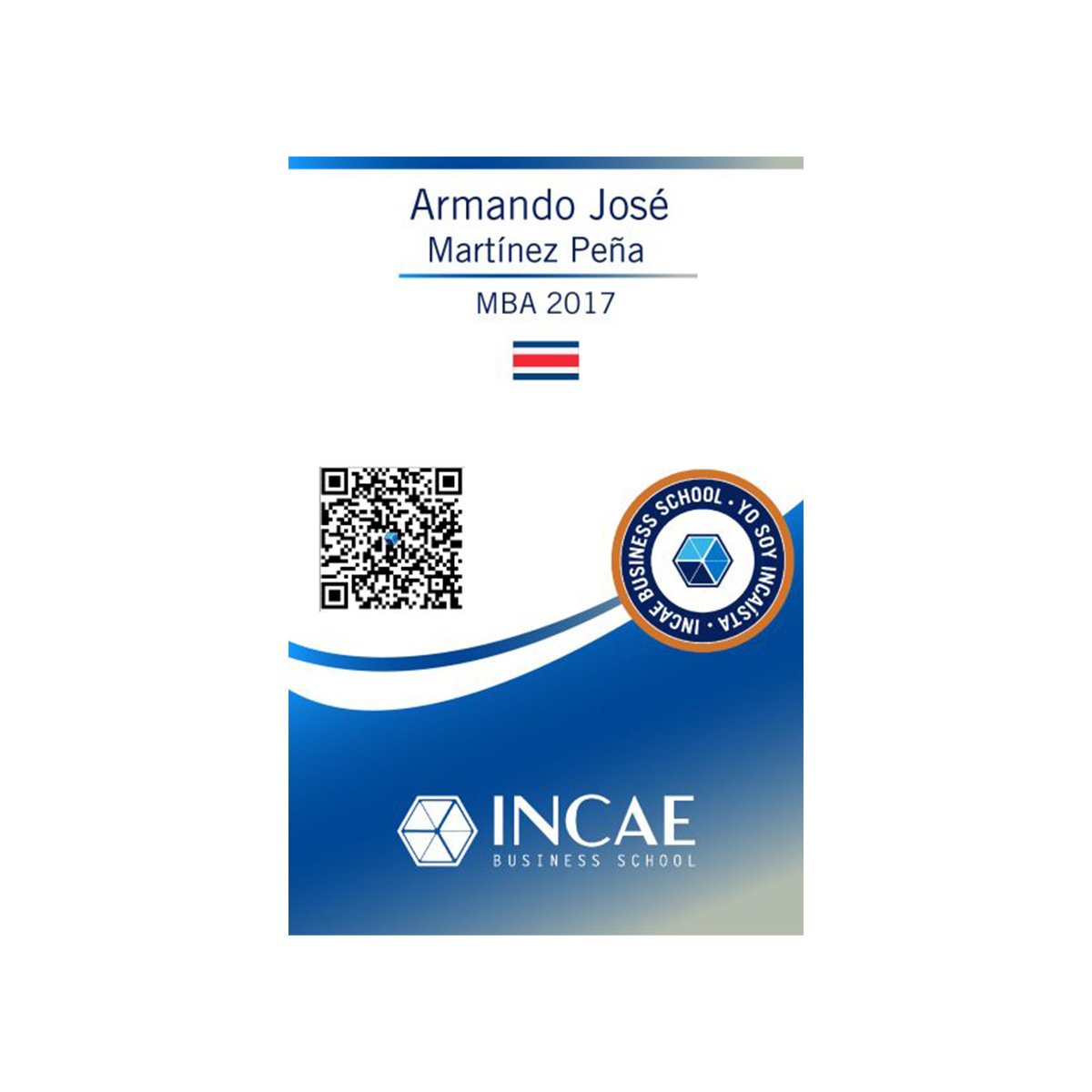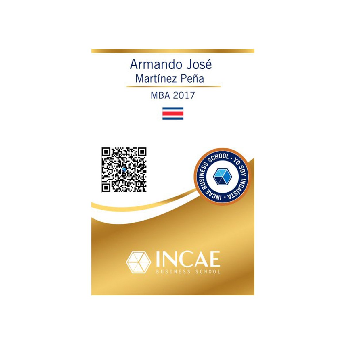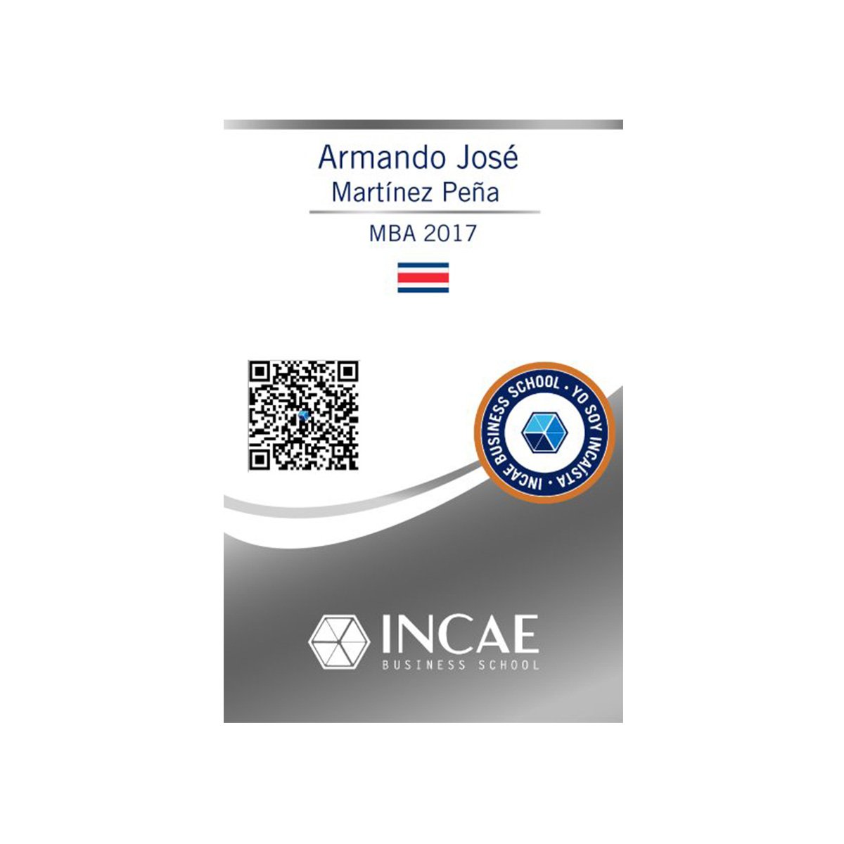 Cada carnet tiene la bandera de su país y la generación de graduado en INCAE, el color azul corresponde de 0 a 10 años, bronce de 11 a 20 años, plata de 21 a 39 años, oro de 40 años o más.
