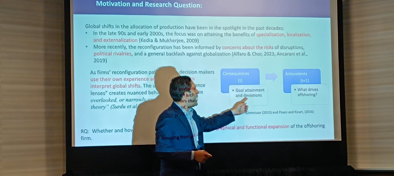 El profesor Carlos Rodríguez presentó su estudio “Linking Strategic Positioning & Implementation: Monitoring Effects Over Profitability”, explorando la relación entre la estrategia y la implementación en la rentabilidad empresarial. Además, junto al profesor Luciano Ciravegna, presentó la investigación “Goal Deviation Responses in Offshoring”, donde analizaron cómo las empresas responden a desvíos en objetivos dentro de procesos de deslocalización.