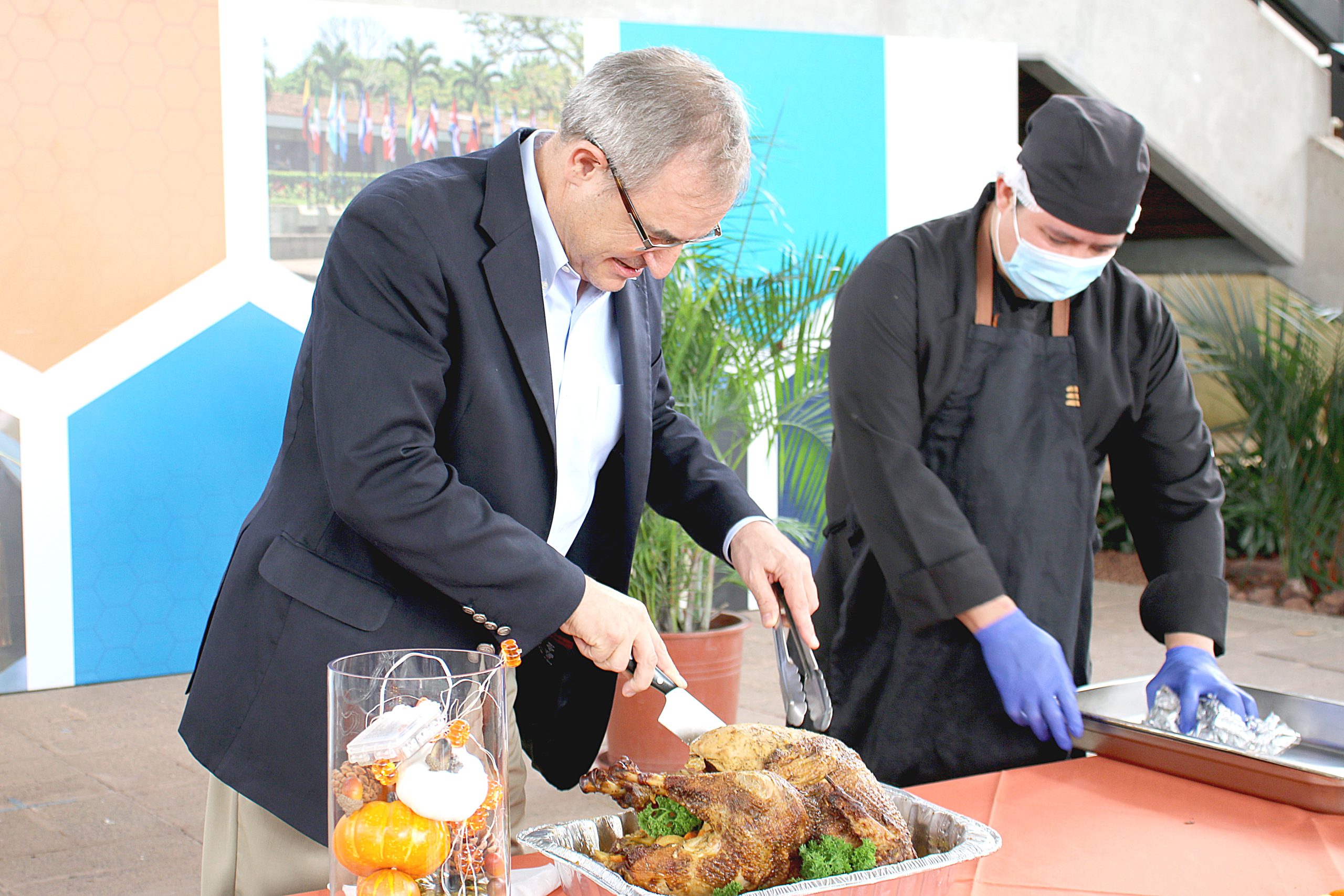 Además agradeció al personal de Vida Estudiantil: Claudia Quintanilla, Guiselle Hernández, Adriana Jiménez y Alonso Pérez, y a todos los que también apoyaron, por su trabajo en organizar esta bella actividad. Posteriormente, el decano Kilian procedió a realizar el tradicional corte del pavo, marcando el inicio de la celebración del almuerzo. Los asistentes disfrutaron de una cena especial en un ambiente lleno de camaradería y gratitud, donde estudiantes y miembros de la comunidad INCAE compartieron momentos significativos que reforzaron los lazos entre ellos.