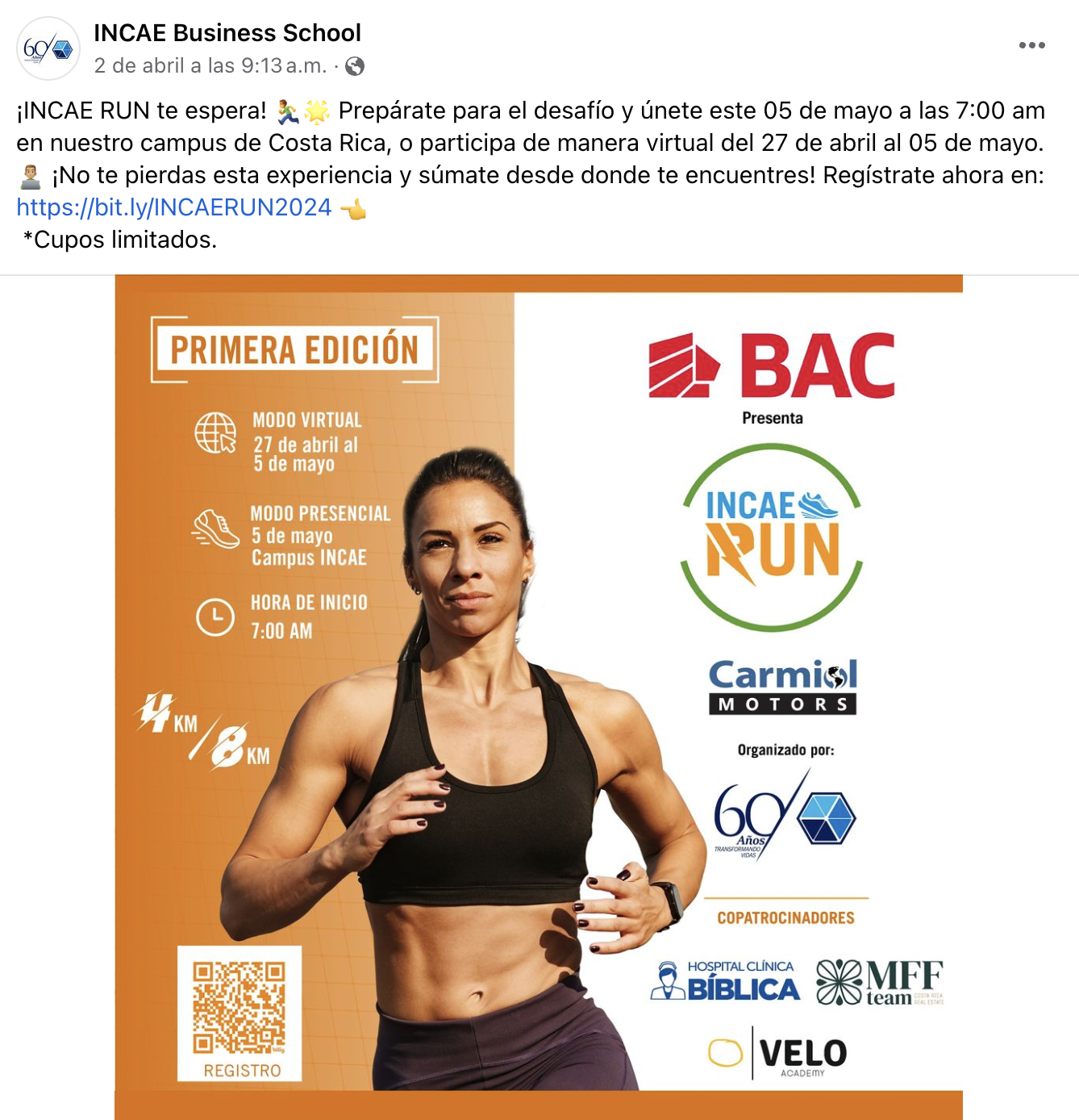 El campus Walter Kissling Gam de INCAE en Costa Rica se prepara para un emocionante evento deportivo, la INCAE RUN, que celebraremos el próximo domingo 5 de mayo a las 7:00 a.m., con la Primera Edición de esta carrera organizada por el Departamento de Career Development & Alumni Experience.