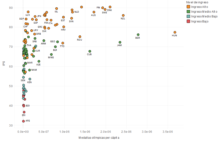 Claro, también hay “datos atípicos”, países que han priorizado el escenario olímpico para promocionar sus gobiernos, como Cuba, que para su nivel de progreso social (IPS: 67.78, ranking IPS:74, ranking en medallas per cápita:15) tiene un alto desempeño olímpico. O como Jamaica que sabiendo aprovechar el talento natural de sus atletas de velocidad se ha posicionado como uno de los países más exitosos en las olimpiadas (IPS: 72.36, ranking IPS:54, ranking en medallas per cápita:4). Pero, sin contar los casos atípicos, las tendencias generales muestran que se necesitan ciertas condiciones del bienestar colectivo para potenciar el talento deportivo del país en deportes de alto rendimiento y en las olimpiadas.