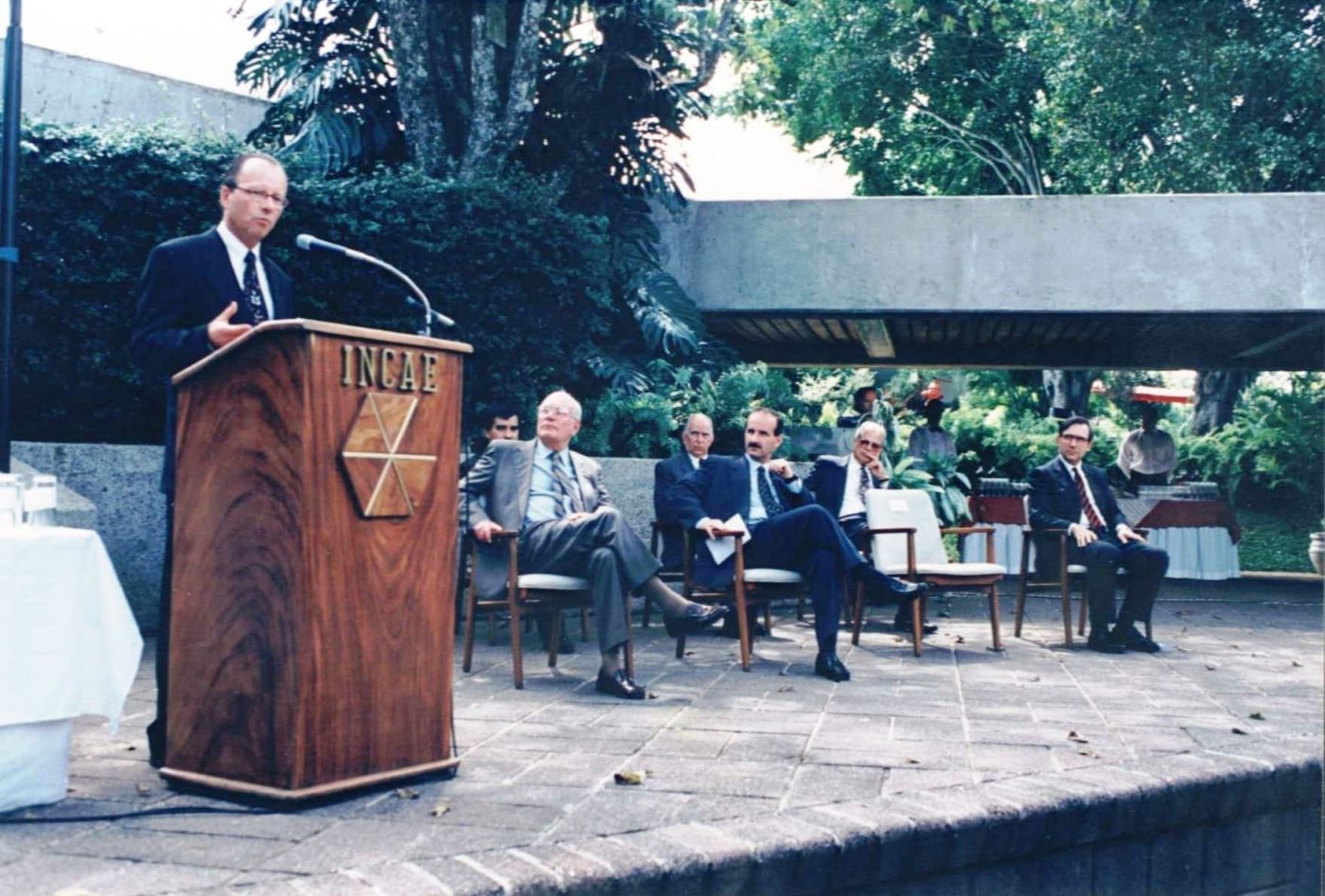 INCAE otorga un doctorado Honoris Causa al empresario y filántropo suizo Stephan Schmidheiny. Gracias a su influencia, INCAE se comprometería institucionalmente con el objetivo del desarrollo sostenible hasta convertirlo en uno de los elementos centrales de sus enfoques académicos, de su posicionamiento y de la diferenciación de sus fuentes de crecimiento.
