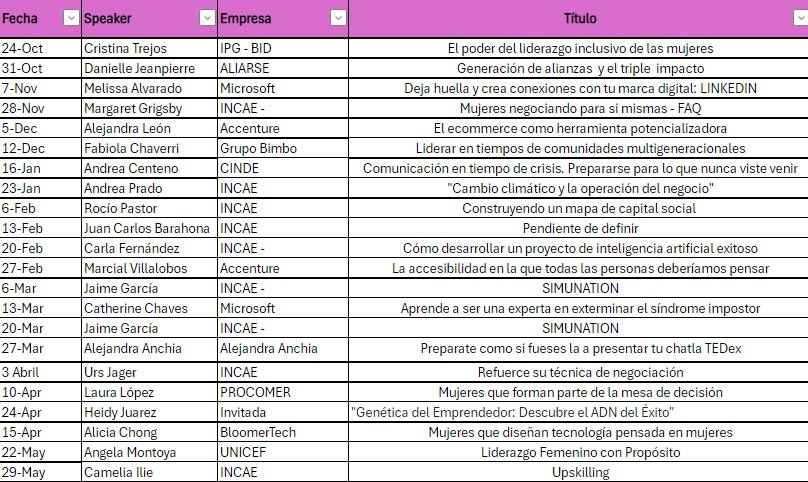 Catalina Rengifo, Employee Engagement Lead Americas Microsoft, y Angela Montoya, Philanthropy Lead for UNICEF Latin America and the Caribbean, son las dos invitadas especiales que tendremos en el evento presencial. Rengifo mostrará el camino hacia la construcción de una comunidad de mujeres potenciada por la sororidad y el interés por el crecimiento colectivo; mientras Montoya abordará consideraciones y consejos prácticos sobre como emprender una carrera internacional exitosa siendo Latinoamericana.